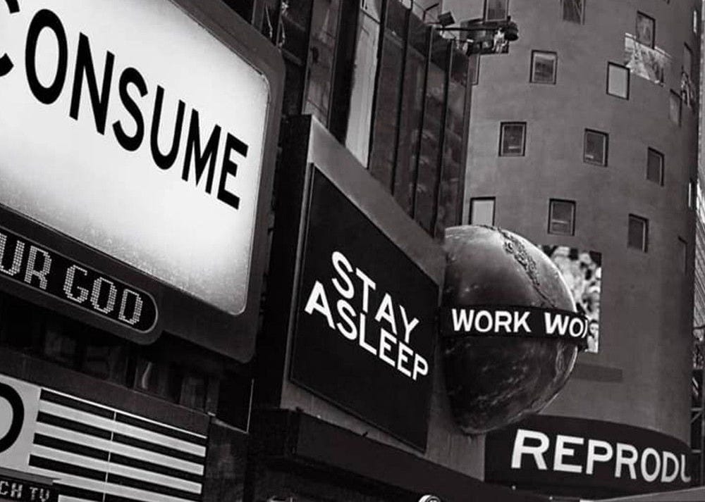 In the 1988 cult sci-fi film ‘They Live’, the protagonist finds a special pair of sunglasses that lets him see the true messages hidden behind advertising signs, billboards, TV and other media. Instead of a beautiful woman holding a product on a billboard he sees a message like “CONSUME”.