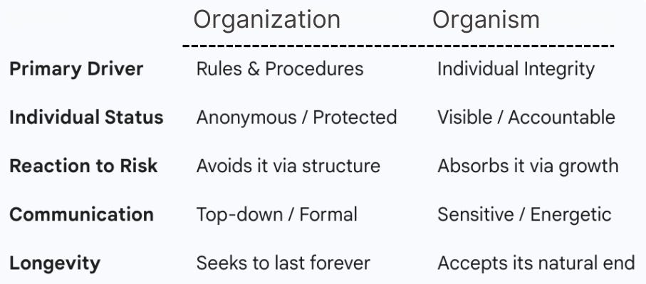 For example, NASA is the ultimate organization. They have manuals for everything, rigid hierarchies, layers of safety. They participate in lots of questionable activities. But when the Apollo 13 oxygen tank exploded, the manual became useless. To survive, the crew and ground control had to shift. They had to use integrity (raw honesty about what was failing) and creativity (building a filter out of duct tape and socks) to evolve in real-time. They became an organism for that moment in time.